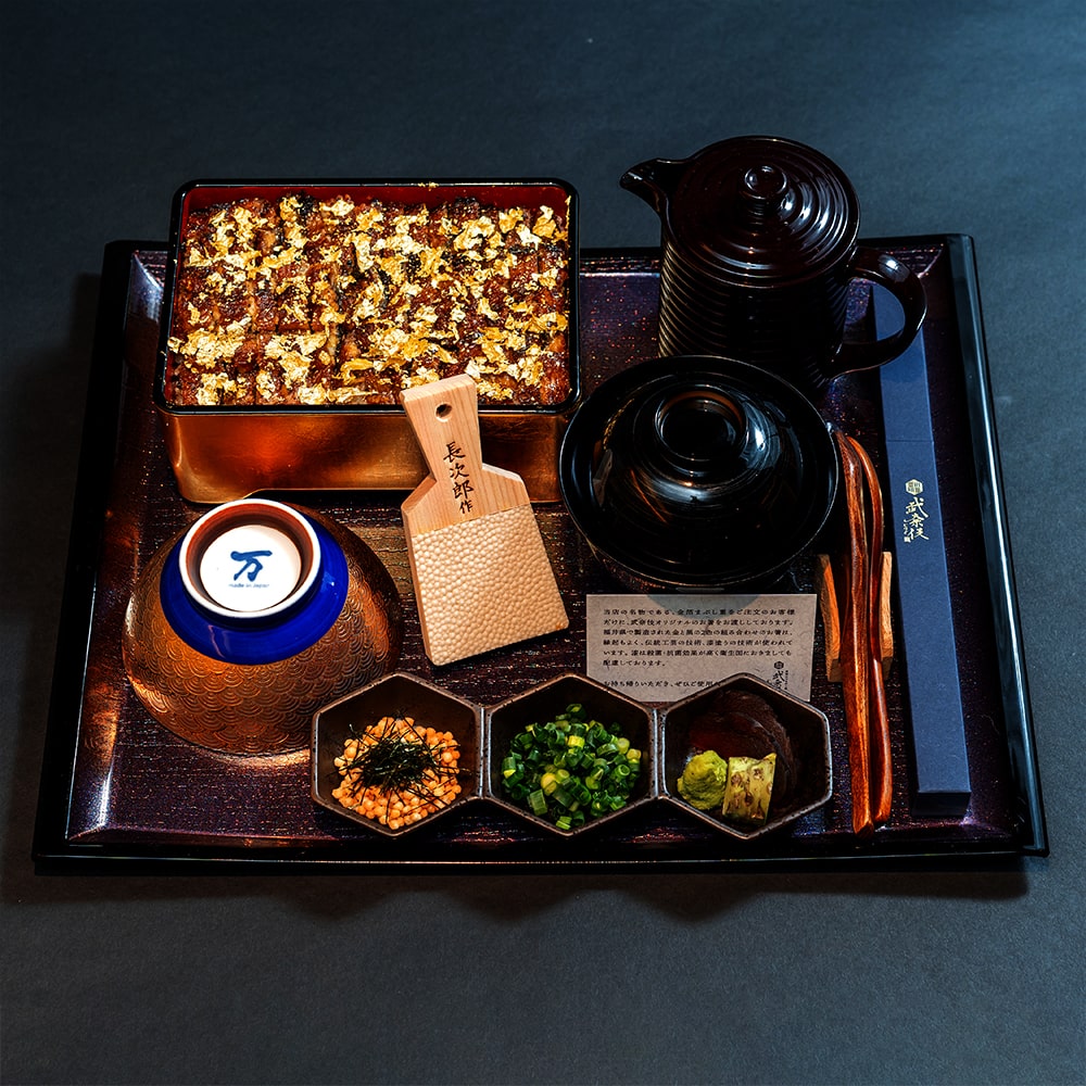 | 内容 | 蒲焼うなぎのながやき 約220g×1 金箔 少量×1 うなぎのたれ・8ml×2本×1人前 山椒・1g×1 ワサビ 1.3g×1袋 |